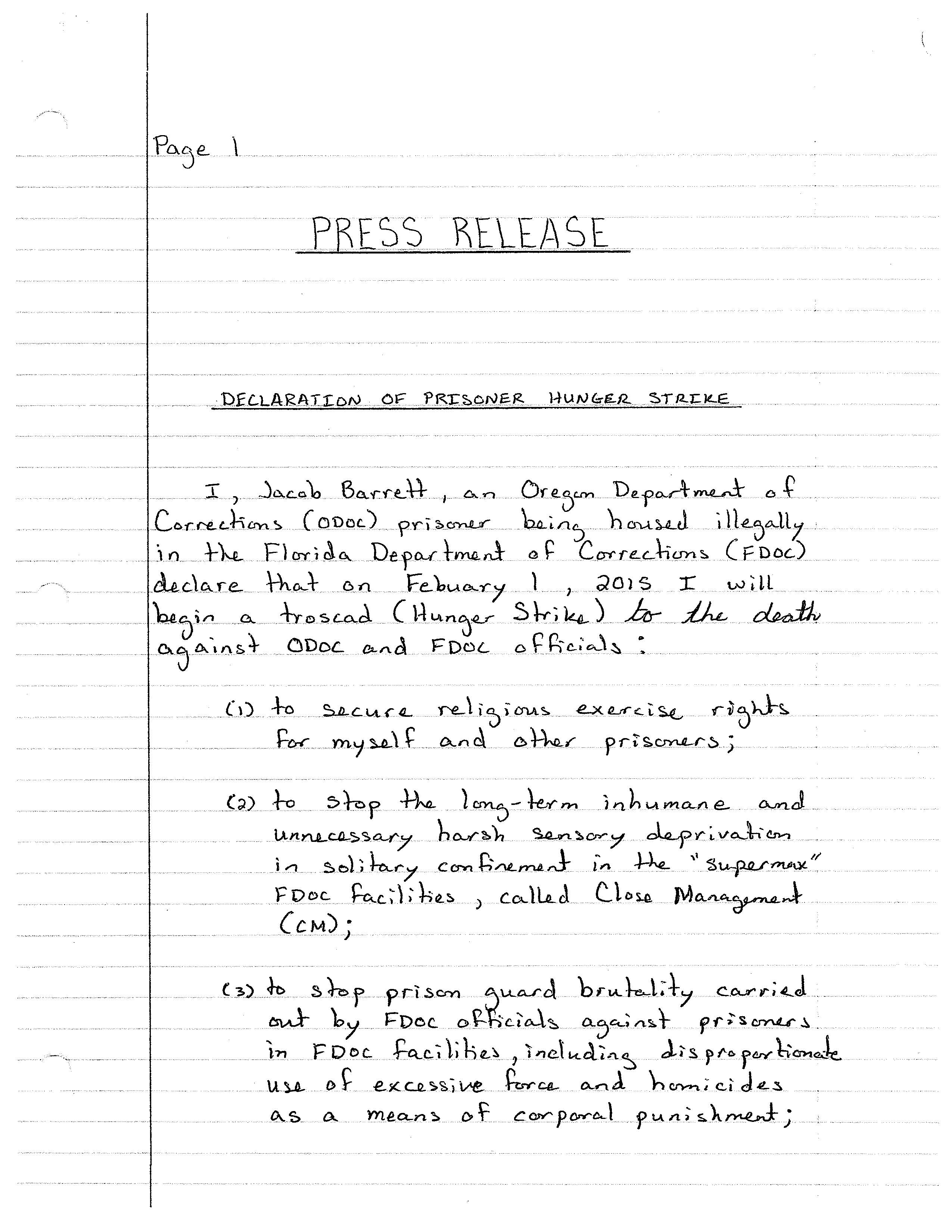 Florida State Prison in Raiford. On February 1, Barrett began a hunger