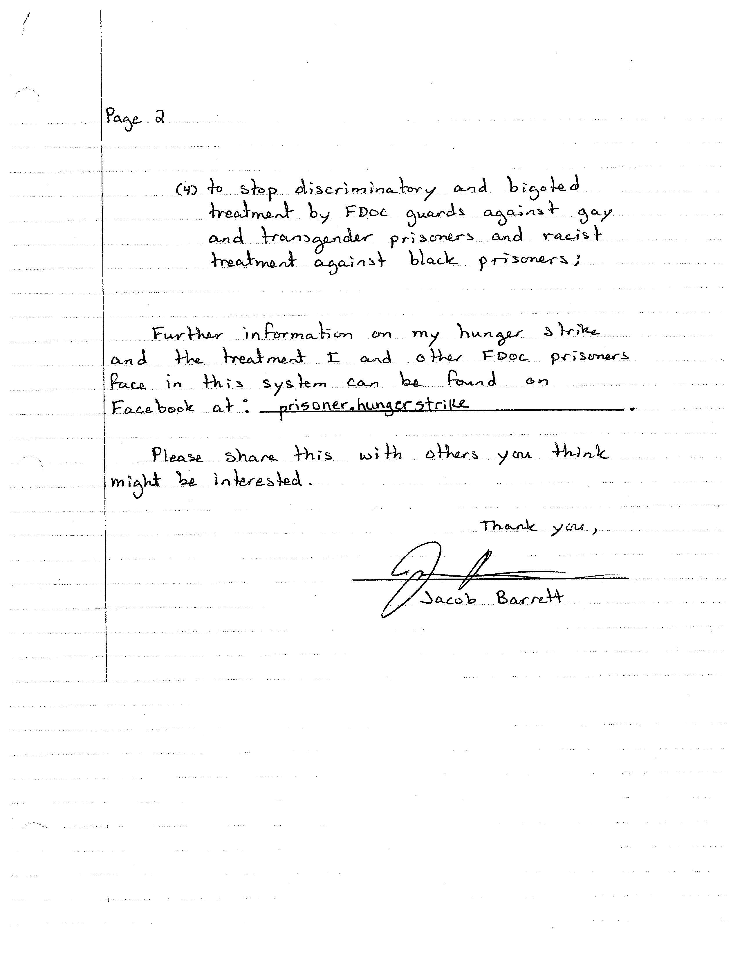 contact prison officials on his behalf, as outlined here: www.facebook.com/ JacobBarrettHungerStrike. —Jean Casella